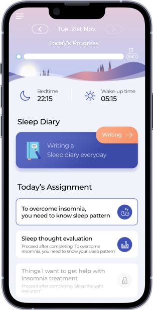 This approach is considered the first-line recommended treatment for insomnia in clinical practice and Somzz provides education, real-time feedback, behavior intervention, and push notification message with a systematic algorithm to insomnia patients over 6 to 9 weeks.