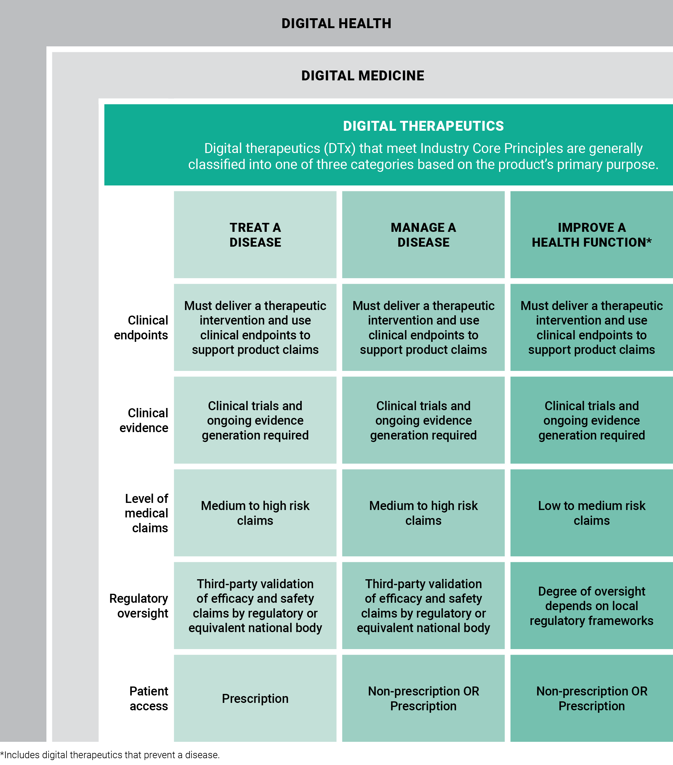 Even though all digital therapeutics adhere to industry core principles, these products fit into three different categories based on the product’s primary purpose and type of intervention delivered to patients. While exceptions may exist, DTx products generally align with one of these three categories: treat, manage, or prevent a disease (which includes the direct improvement of a health function).