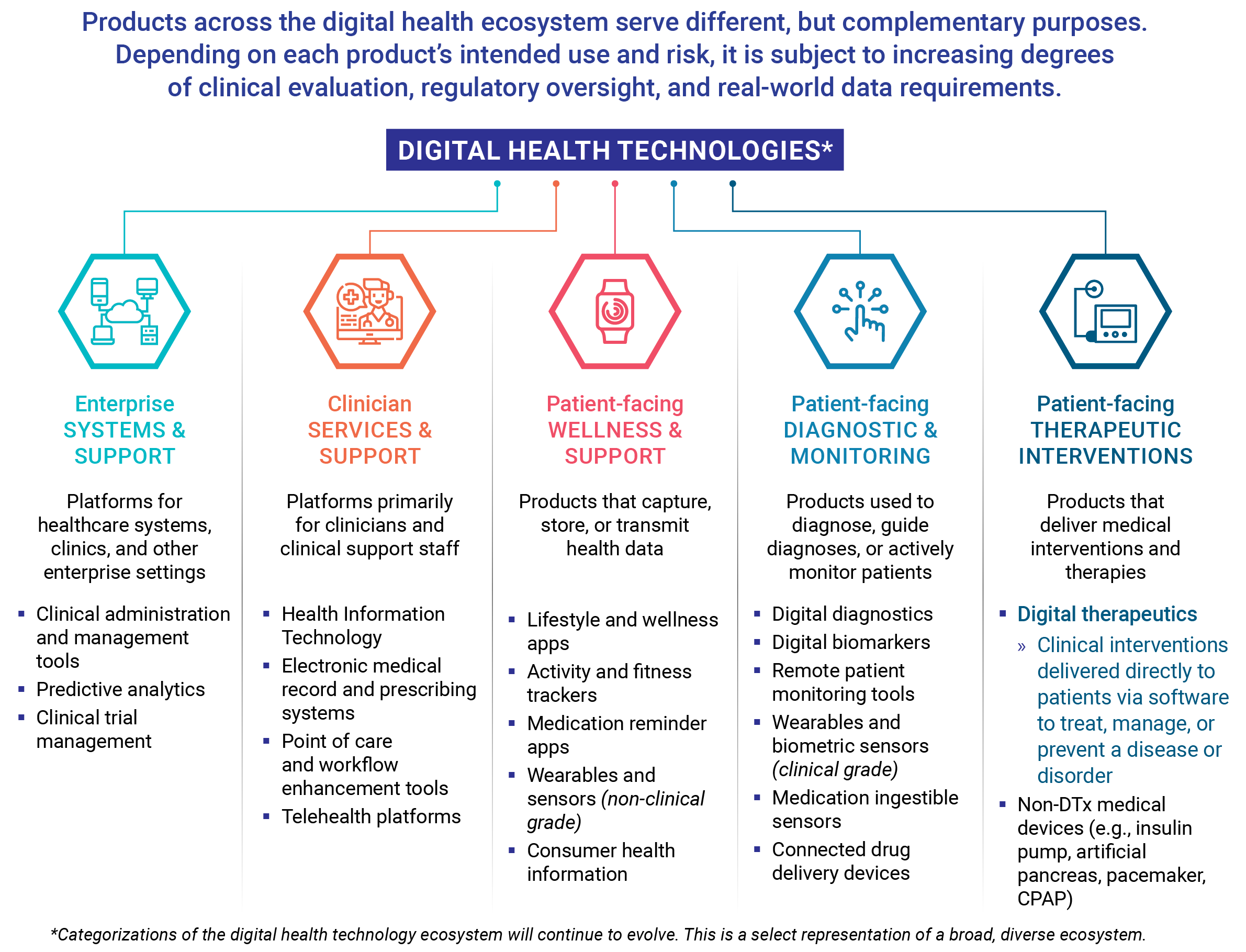 Compared to products that track fitness, encourage medication adherence, or monitor patient activity, DTx products deliver medical interventions directly to patients. As such, digital therapeutics undergo rigorous testing and are held to the same standards of evidence and regulatory requirements as traditional medical treatments.